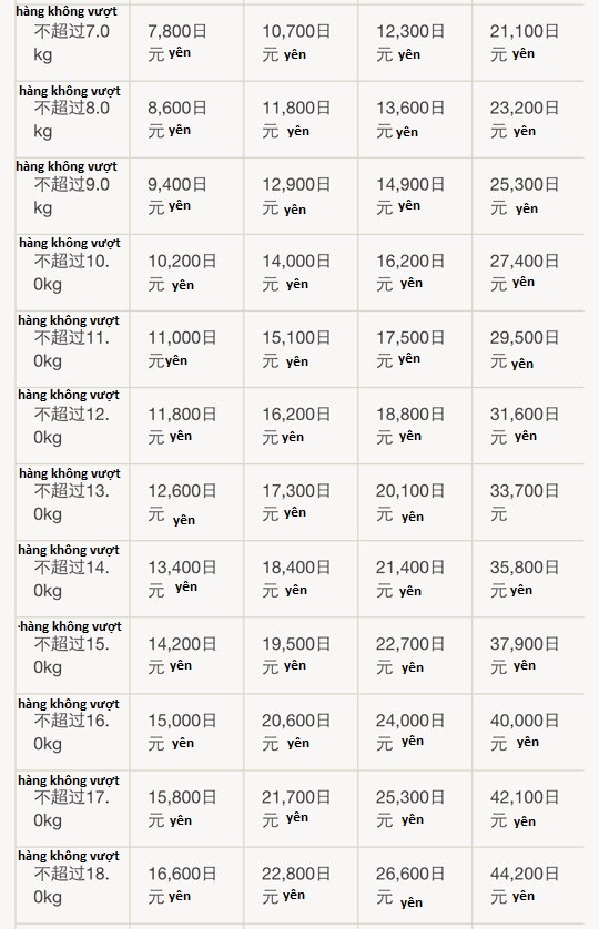 Chính vì vậy, nếu bạn muốn gửi hàng từ Nhật Bản về Việt Nam với chi phí thấp nhất sẽ rơi vào khoảng 900 cho hàng 300g. Còn nếu vận chuyển đường hàng không sẽ là 1700 yên cho hàng 500g và vận chuyển bằng đường biển là 1500 yên cho hàng 1kg.